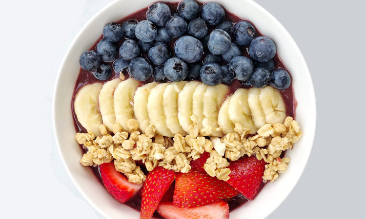 A delicious and healthy Acai bowl with Acai, Chia Seeds, Honey, Coconut Chips, Bananas, Strawberries, Blueberries and Granola. No substitutions, only subtractions.