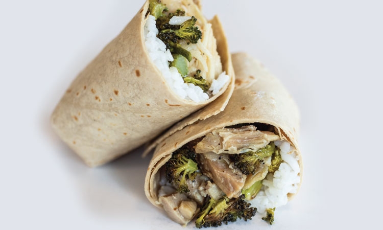 A delicious combination of Coconut Rice, Sesame Ginger Broccoli and Teriyaki Chicken drizzled with Creamy Wasabi Sauce and wrapped in a warm, gluten-free flour tortilla.