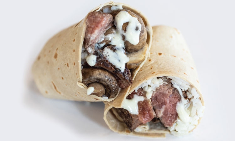 A delicious combination of Basmati Rice, Roasted Mushrooms and Grilled, Marinated Steak drizzled with Creamy Wasabi Sauce and wrapped in a warm, gluten-free flour tortilla.