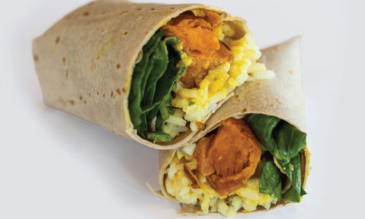 A delicious combination of Fresh Baby Spinach, Coconut Rice, Sesame Ginger Broccoli and Roasted Sweet Potatoes drizzled with Coconut Sweet Potato Sauce and wrapped in a warm, gluten-free flour tortilla.