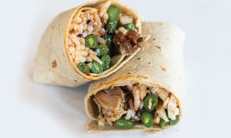 A delicious combination of Basmati Rice, Garlicky Cilantro Green Beans and BBQ Chicken drizzled with Citrus Ginger Dressing and wrapped in a warm, gluten-free flour tortilla.
