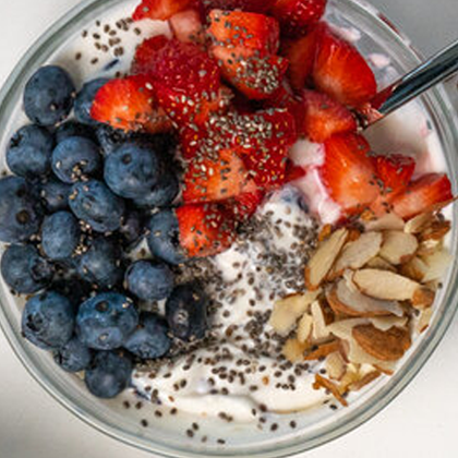 A delicious and healthy Mixed Fruit bowl with Greek Yogurt, Chia Seeds, Honey, Almonds, Strawberries, Blueberries and Granola. No substitutions, only subtractions.
