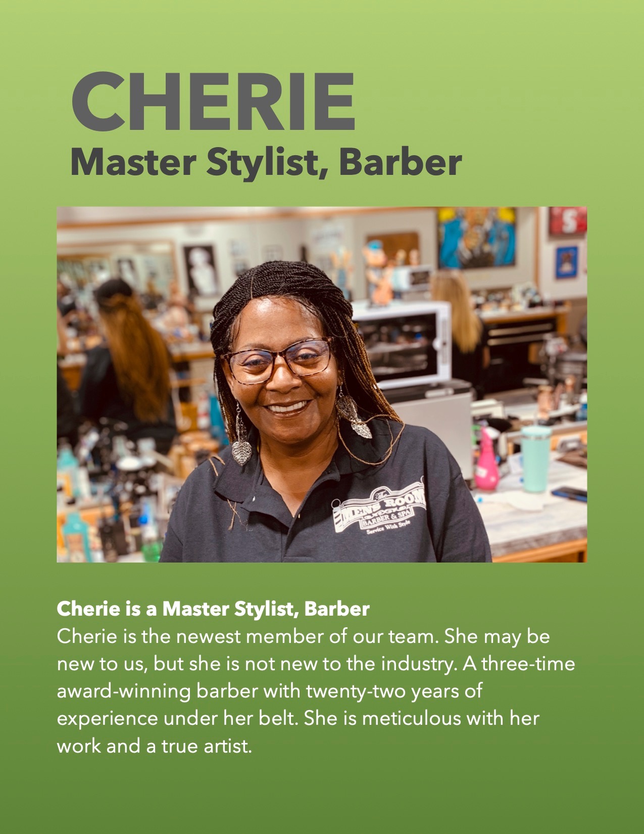 Cherie is a Master Stylist, Barber. Cherie is the newest member of our team. She may be new to us, but she is not new to the industry. A three-time award-winning barber with twenty-two years of experience under her belt. She is meticulous with her work and a true artist.