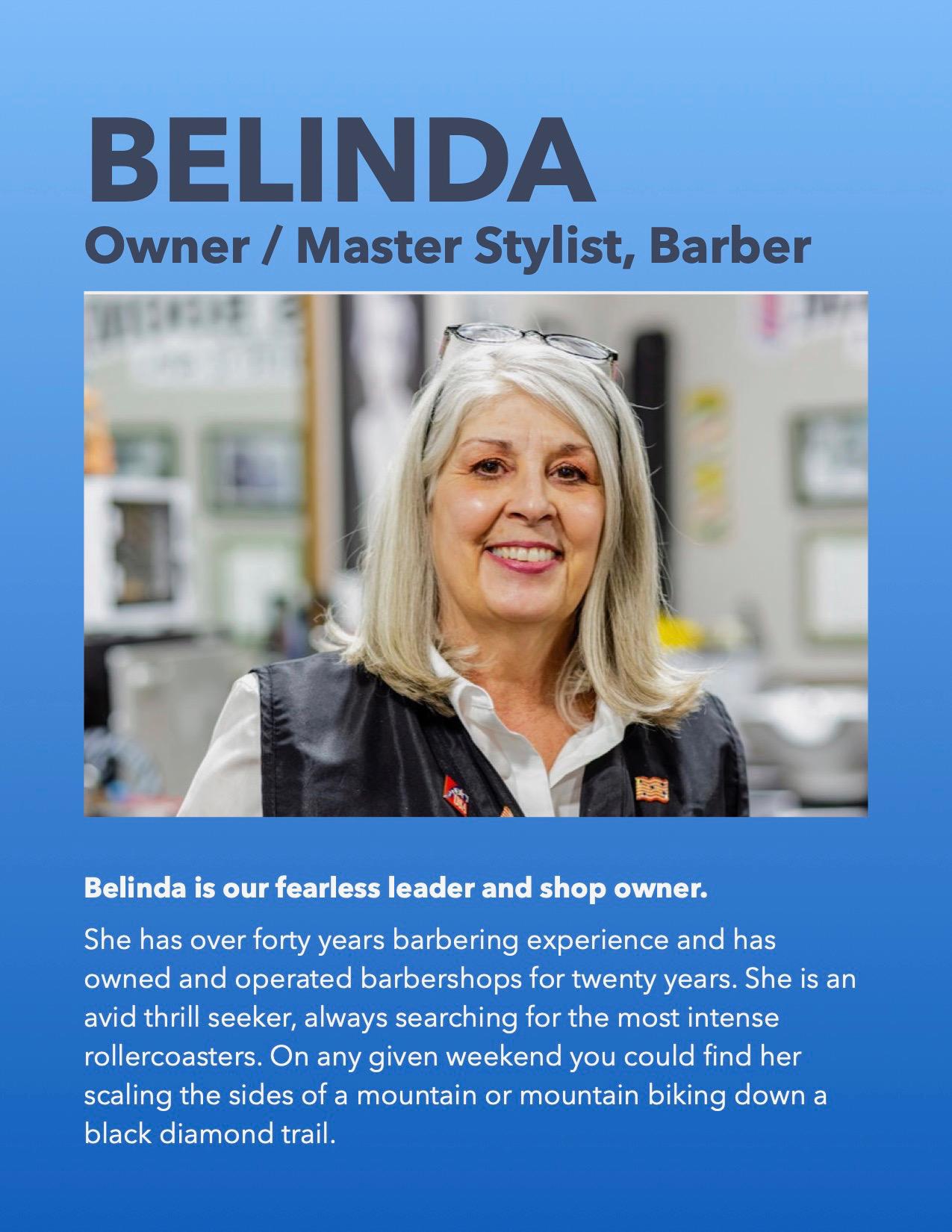 Belinda is our fearless leader and shop owner. She has over forty years of barbering experience and has owned and operated barbershops for twenty years. She is an avid thrill seeker, always looking for the most intense rollercoasters. On any given weekend you could find her scaling the sides of a mountain or mountain biking down a black diamond trail.